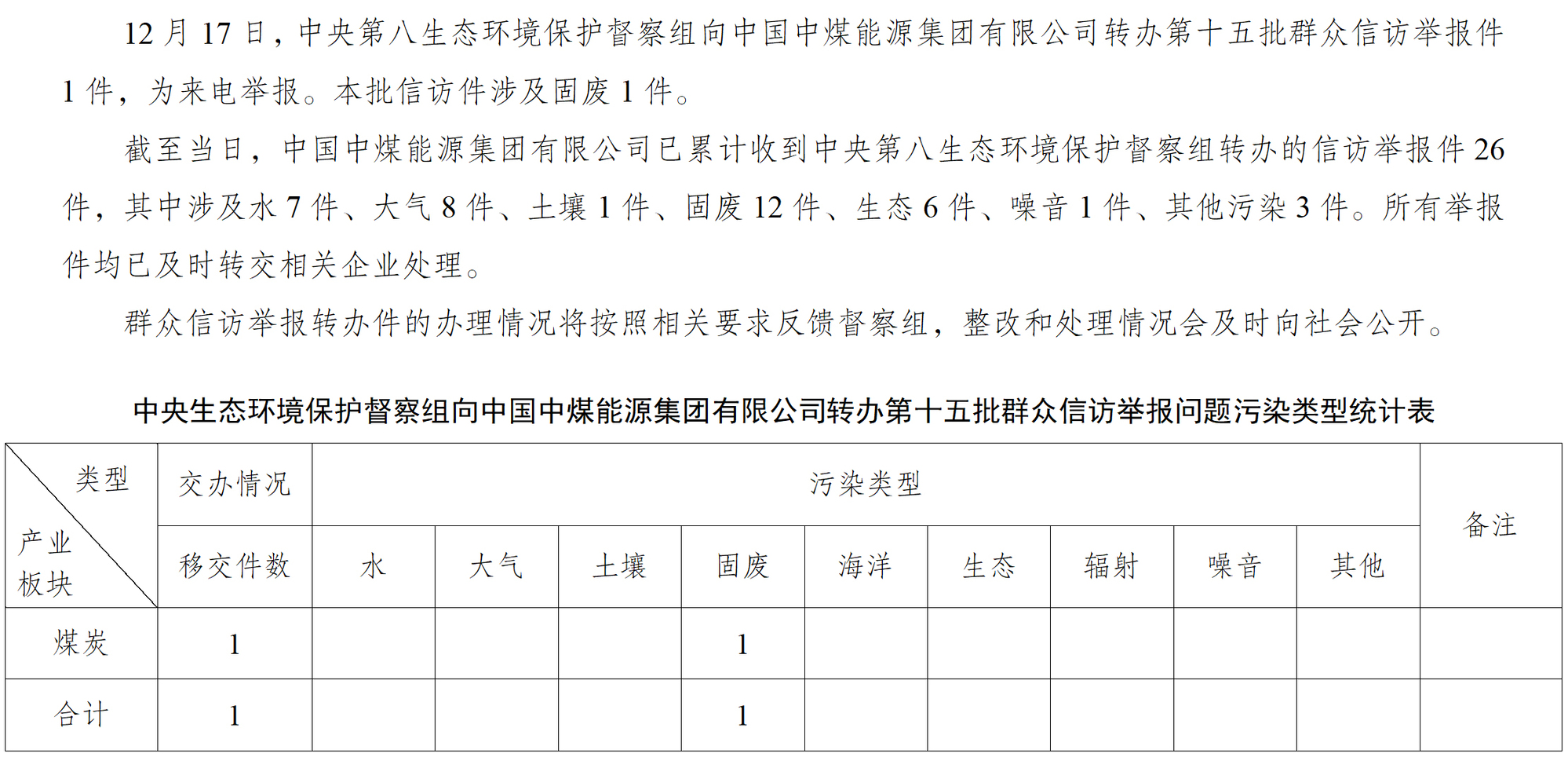 中央第八生態環境保護督察組向中國中煤能源集團有限公司轉辦第十五批群眾信訪舉報件
